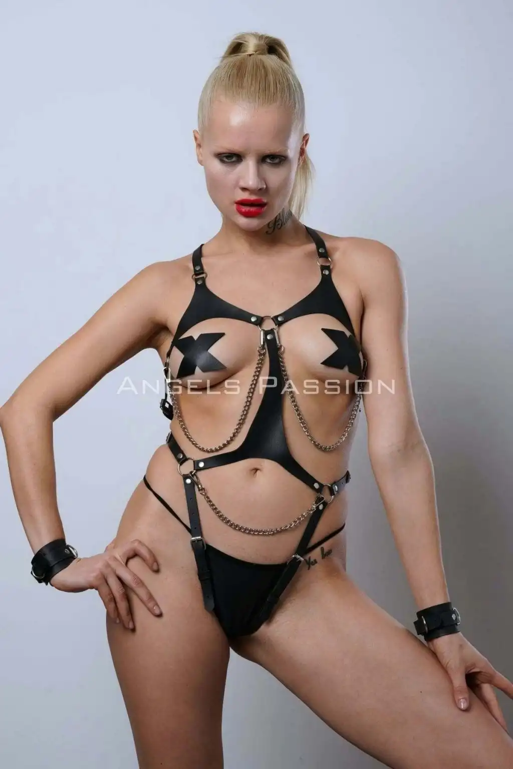 • Ürün ve paket içeriği: 3 parça (1 ad. Deri Harness , 2 ad. Kelepçe ) göğüs ucu kapatıcı dahil değildir.