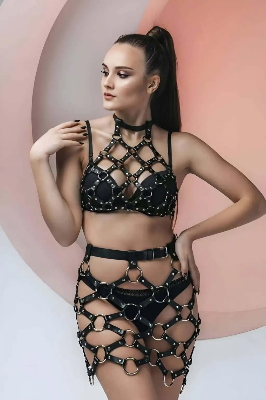 • Ürün ve paket içeriği: 2 parça (1 ad. Deri Göğüs Harness , 1 ad. Deri Etek Harness) iç çamaşırı dahil değildir