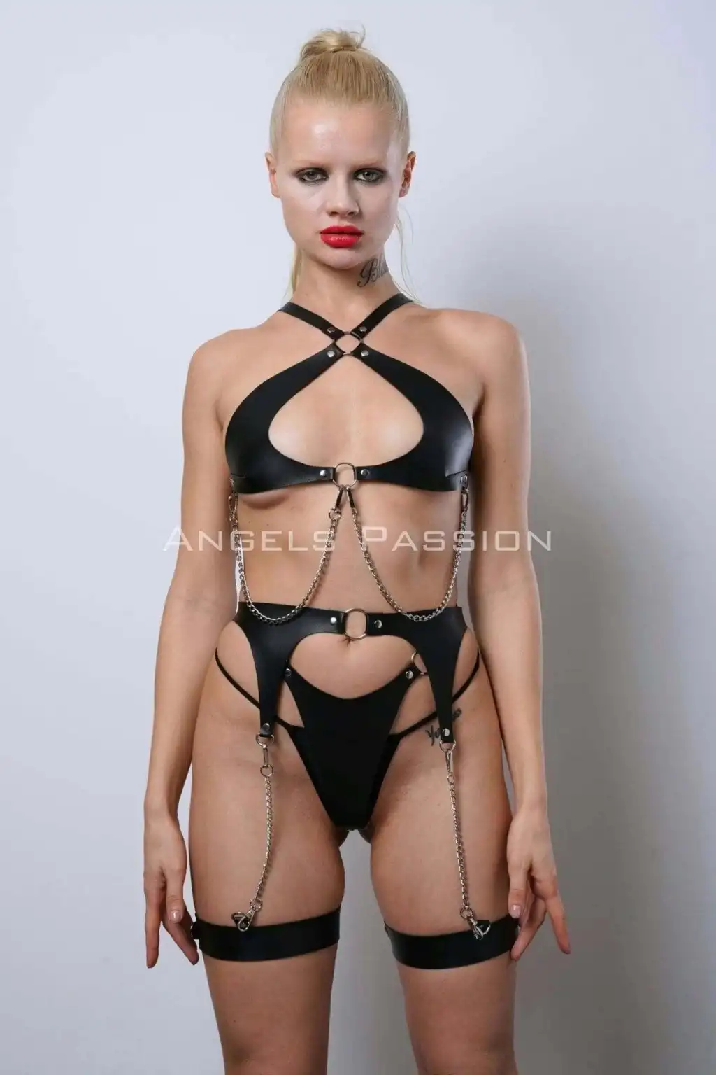 Deri Fantezi İç Giyim Takım, Şık Deri Harness Set, Club Wear - APFT1330