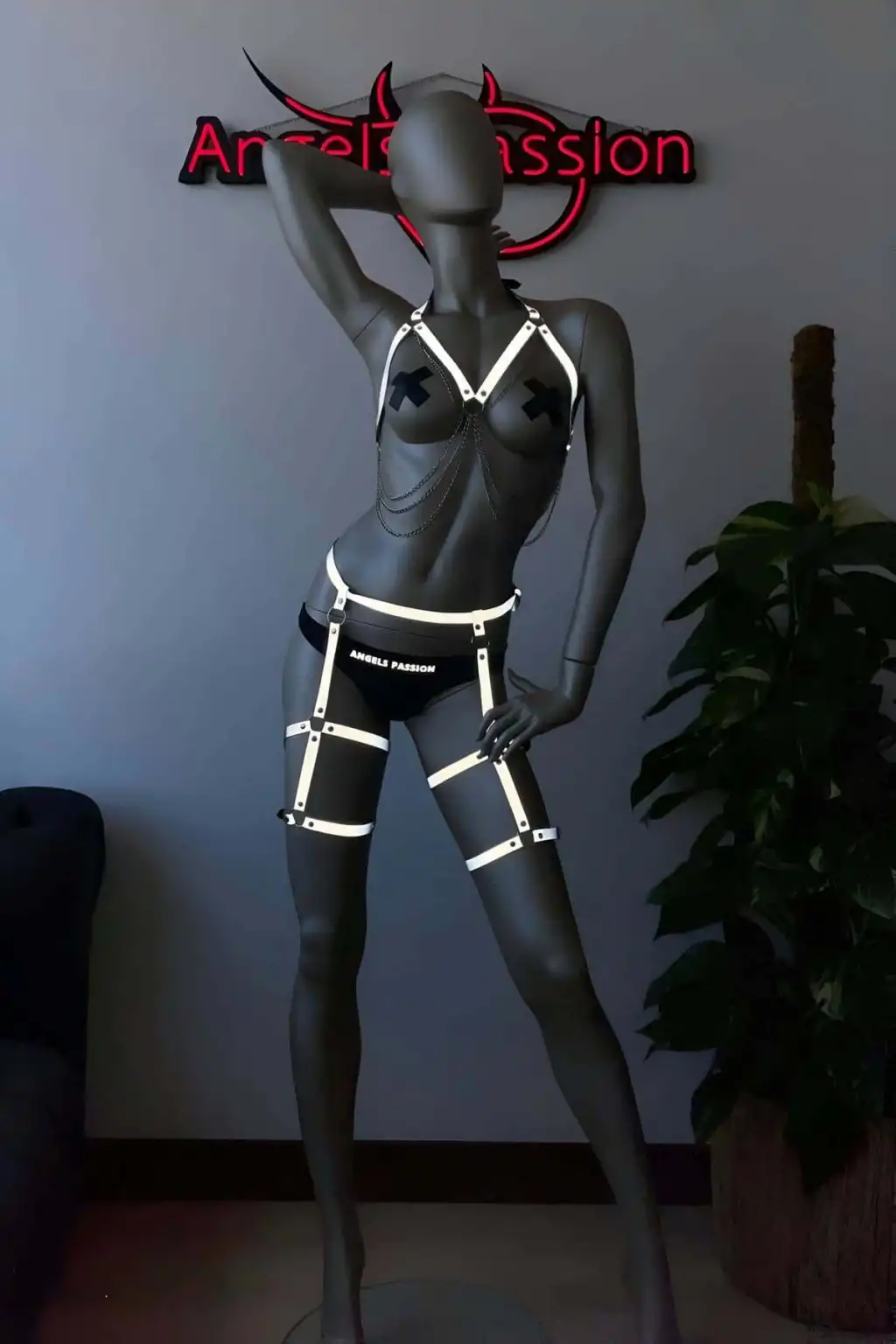 Erotik Giyim Dans Elbiseleri Reflektörlü Jartiyer Harness Takım - APFT497