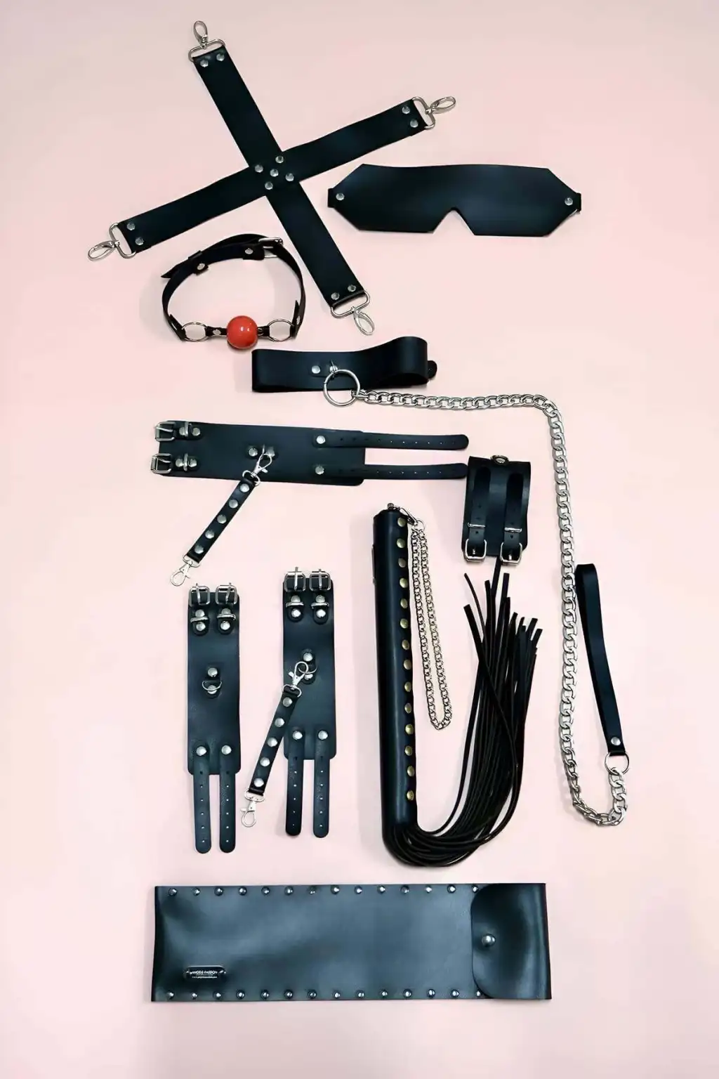 • Ürün ve paket içeriği: 7 parça (Kırbaç ve kırbaç kılıfı, el kelepçe takım, ayak kelepçe takım, tasma, ağız topu, maske ve X bağlama aparatı)