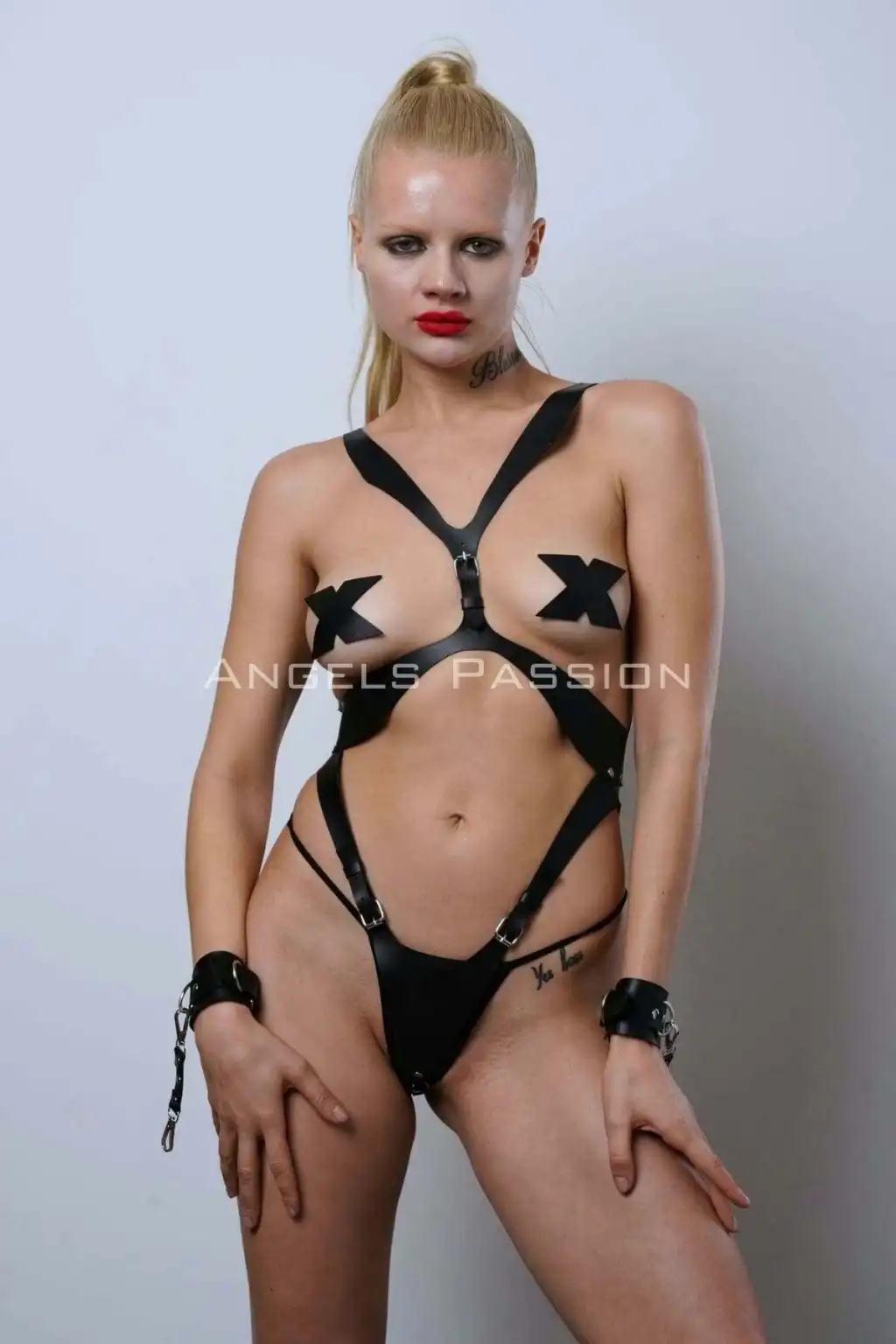 Kelepçeli Full Body Harness Set, Deri Fantezi İç Giyim, Bayan İç Giyim - APFT1102