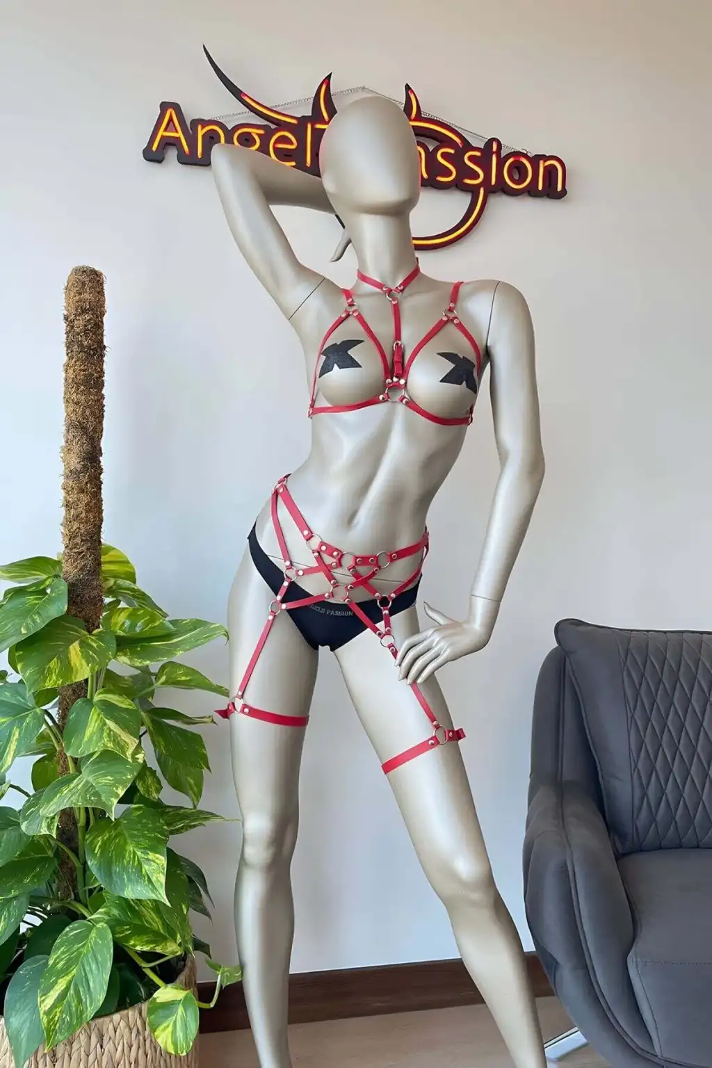 Kırmızı Deri Jartiyer ve Büstiyer Takım