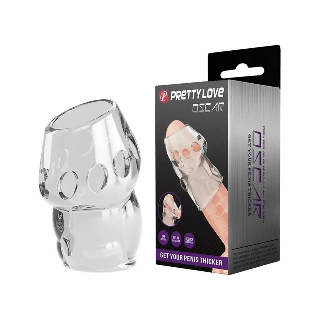 PRETTY LOVE Oscar penis kılıfı, daha dolgun his, daha kontrollü tempo ve daha uzun süren keyif isteyenler için tasarlanmış şeffaf TPR (yumuşak ve esnek) bir cock sleeve modelidir. Esnek yapısı sayesinde penise yakın sarım yaparak “kalınlaştırıcı” etki hissi verir; kapalı uçlu tasarımı ise özellikle glans (baş) bölgesindeki doğrudan teması azaltmaya yardımcı olarak uyarımı dengelemeyi hedefler. Bu sayede erken boşalma kontrolünde destekleyici bir kullanım sunar.Kılıf üzerindeki çoklu delik tasarımı hem esnemeyi kolaylaştırır hem de hava/sirkülasyon hissi sağlayarak daha konforlu bir kullanım amaçlar. Yumuşak dokusu cilde uyumlu bir his verirken, formu sayesinde yerinde durmaya yardımcı olur. Solo kullanımda kontrolü artırmak, partnerli kullanımda daha dolgun bir deneyim hedeflemek için tercih edilebilir.Kullanım önerisi: Daha rahat takıp çıkarmak ve sürtünmeyi azaltmak için su bazlı kayganlaştırıcı ile kullanman iyi olur. İlk kullanımdan önce ve sonra ılık su + nazik sabunla yıkayıp tamamen kurutarak saklayabilirsin.Not: Bu ürün korunma amaçlı değildir, prezervatif yerine geçmez.Ölçüler (görseldeki teknik ölçü)Toplam yükseklik: 64 mm (6,4 cm)Üst genişlik: 36 mm (3,6 cm)İç çap: 26 mm (2,6 cm)Dış çap: 30 mm (3,0 cm)(Esnek TPR yapı sayesinde ölçüler kullanımda esneyerek uyum sağlar.)Öne ÇıkanlarTPR malzeme: yumuşak, esnek, cilt dostu hisKalınlaştırıcı his ve daha sıkı sarımGeciktirmeye yardımcı kapalı uçlu tasarım (uyarımı dengeleme)Delikli gövde: esneklik + konfor odaklı tasarım