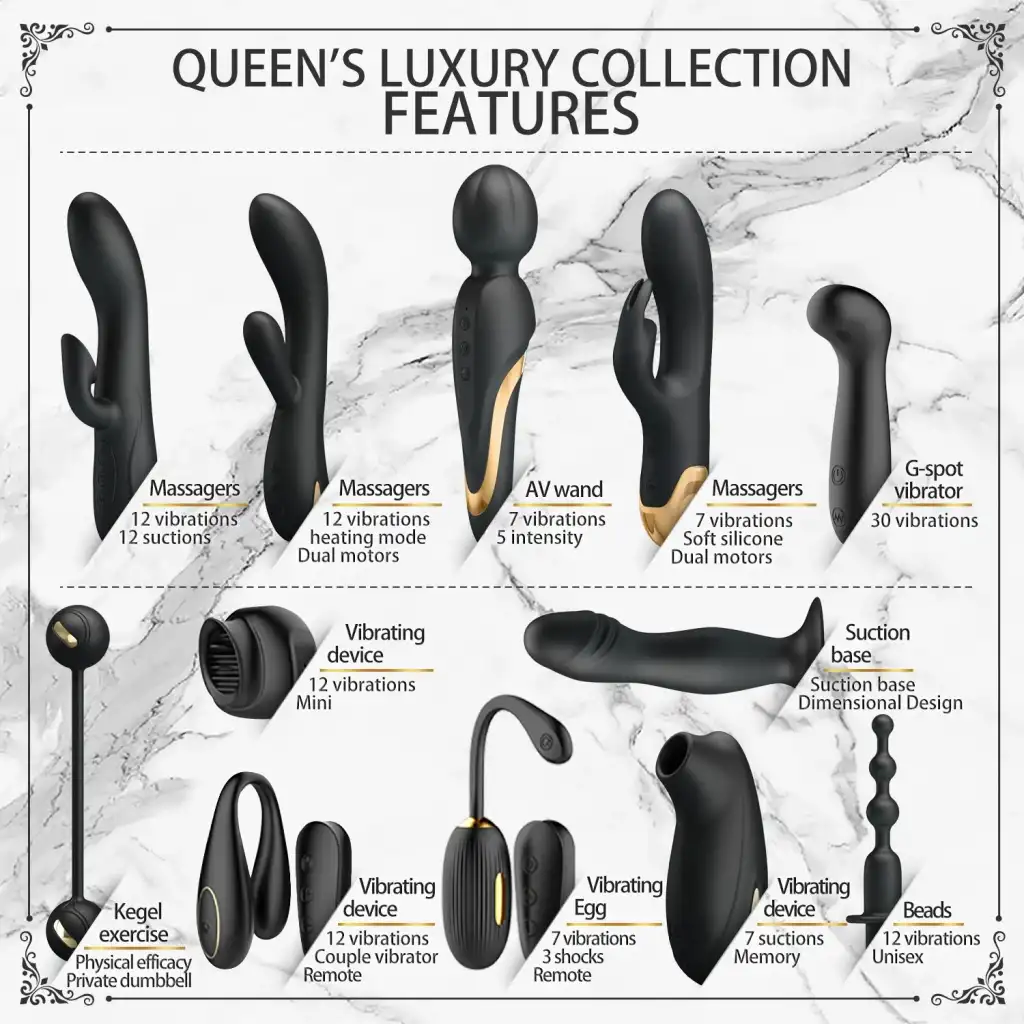 Pretty Love Queen’s Luxury Collection, çiftler için tasarlanmış 12 parçalık “altın detaylı siyah” premium bir keşif setidir. Tek bir kutuda; farklı uyarım stillerini (titreşim, emiş, ısıtma, uzaktan kumanda ve kegel egzersizi) bir araya getirerek her seferinde farklı bir deneyim oluşturmanıza yardımcı olur. Yumuşak silikon dokusu, suya dayanıklı gövdesi ve USB şarj özelliğiyle pratik ve uzun ömürlü kullanım hedefler. Set içindeki parçalar; klitoral uyarım, G-noktası odaklı masaj, çift kullanımı, kegel çalışması ve anal bölge için seçenekler sunar. İster “hafif ve romantik”, ister daha güçlü modlarla ilerleyin—seçim tamamen sizde.Kutu İçeriği (12 Parça)Çift vibratörü (uzaktan kumandalı) – 12 titreşim modu, hafıza fonksiyonuEmiş + titreşimli uyarıcı – 12 emiş / 12 titreşim seçenekleriIsıtmalı çift motorlu masaj cihazı – 48°C ısıtma + 12 titreşimAV wand (masaj başlığı) – 7 titreşim, 5 yoğunlukRabbit tipi çift uyarımlı vibratör – 7 titreşim (Red Dot 2018 tasarım ödülü ibareli)G-noktası vibratörü – 30 titreşimDual licking (yalama simülasyonlu) uyarıcı – 12 modSuction (vantuz) tabanlı tasarımlı parçaVibrating egg (uzaktan kumandalı) – 7 titreşim + 3 elektrik uyarı moduEmiş cihazı – 7 emiş, hafıza fonksiyonuTitreşimli anal boncuk – 12 titreşimÇift kegel egzersiz aparatıÖne Çıkan ÖzelliklerYumuşak silikon, suya dayanıklı tasarımUSB şarjlı kullanım (bazı parçalarda kumanda)Farklı modlarla kişiselleştirilebilir deneyimŞarj Uyarısı (Önemli)Bu seride iki farklı şarj ucu bulunur:Mavi şarj girişi = 12mm pinKırmızı şarj girişi = 14mm pinYanlış kablo kullanımı ürüne zarar verebilir; lütfen doğru ucu eşleştirerek şarj edin.