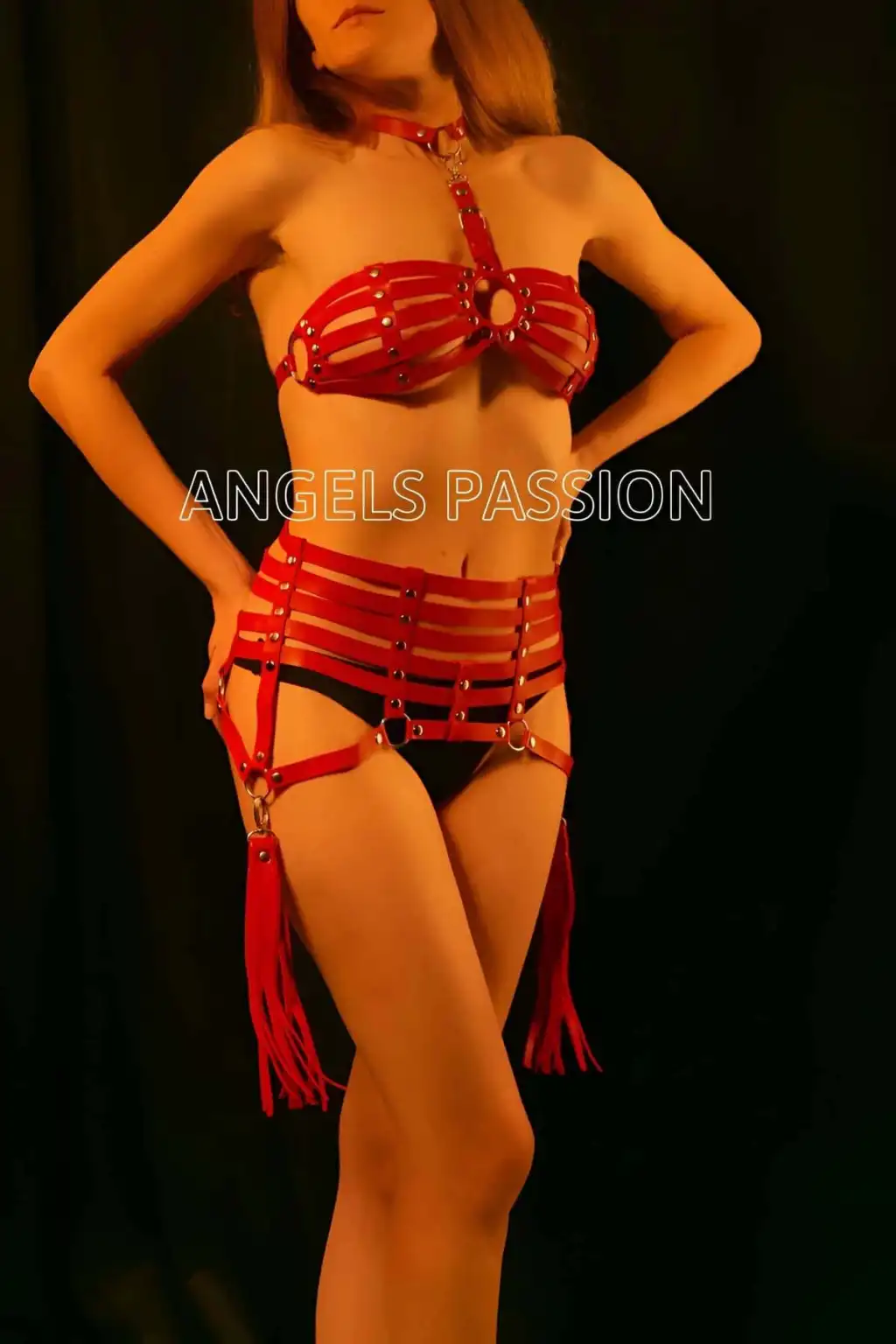 Püskül Detaylı Kırmızı Deri Korse Sütyen Harness Takım