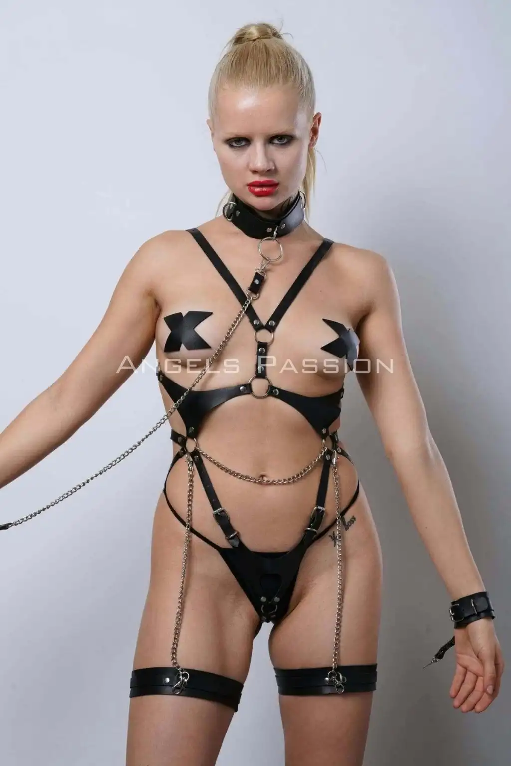 • Ürün ve paket içeriği: 6 parça (1 ad. Deri Vücut Harness  , 2 ad. Bacak Bandı , 1ad. Tasma , 2 ad. Kelepçe) iç çamaşırı dahil değildir