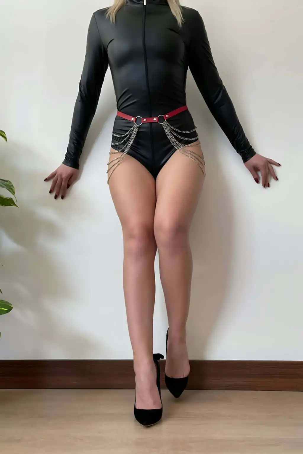 Zincirli Kırmızı Deri Bel Kemeri